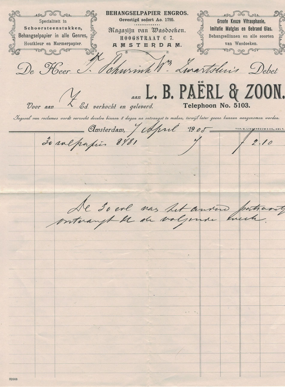 Bij elkaar horende factuur en nota uit 1907, in kleurendruk, wat in die tijd uitermate zeldzaam was.