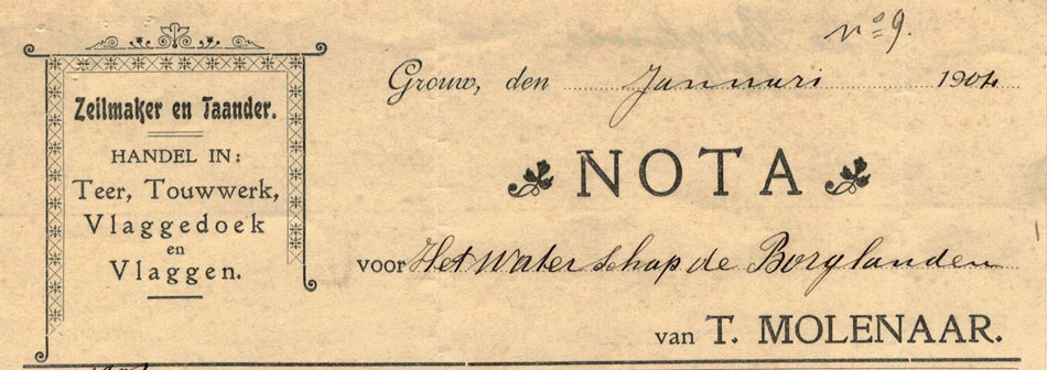 Rekening uit 1904 (afm. 17 x 12 cm) voor het Waterschap Borglanden (achterop staat: "voor de Borglands Molen") voor in 1903 herstelde zeilen, met fraaie Jugendstil versieringen in het briefhoofd. Conditie 2 lichte vouwen en enkele heel lichte nietjes-sporen, heel mooi ! Prijs € 20