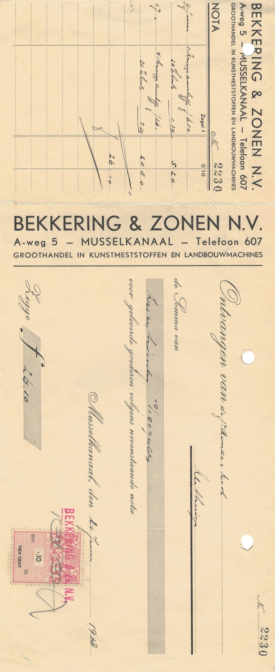A-weg 5 Musselkanaal, Ontvangstbewijs uit 1938, met belastingzegel, Prijs € 7.