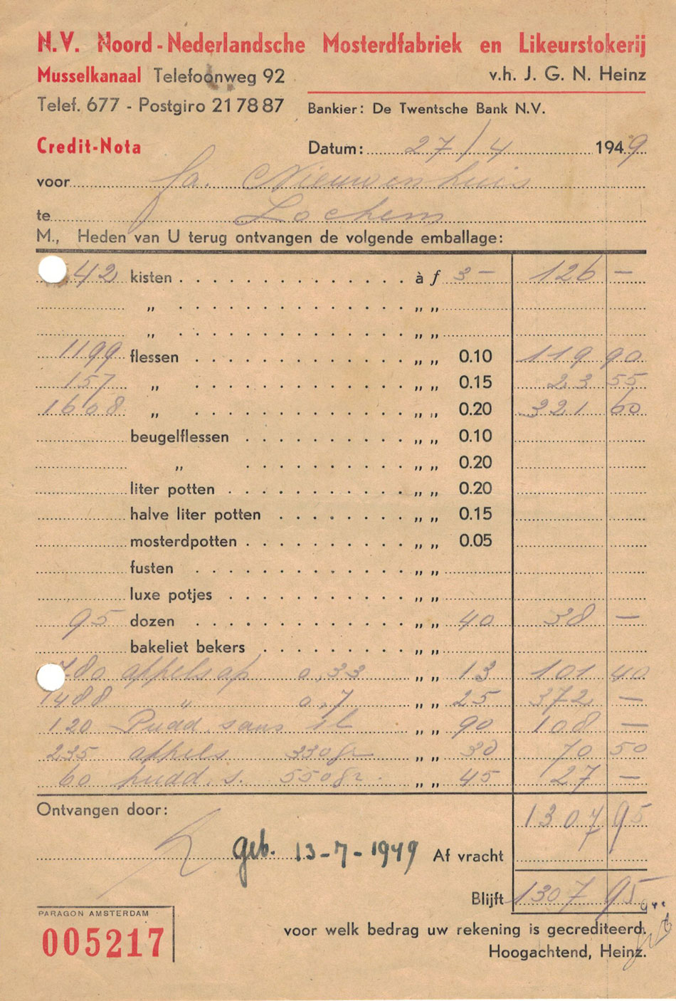 Nota (zelfde type als hier boven) uit 1949 met rode druk, afm. ca. 20 x 21 cm.