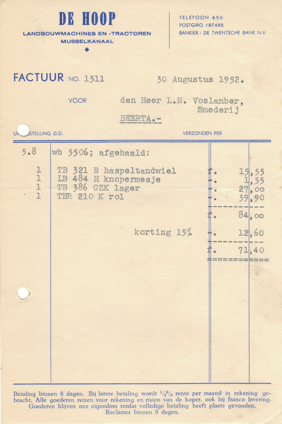 ---------- 1952, rekening, afm. ca. 18,5 x 27 cm., Prijs € 8