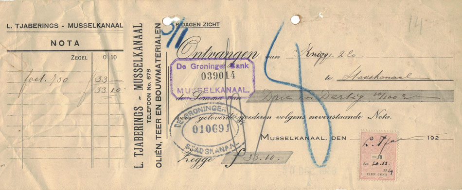 Musselkanaal, 1933, ontvangstbewijs met belastingzegel, beschadigde archiefgaten, Prijs € 5