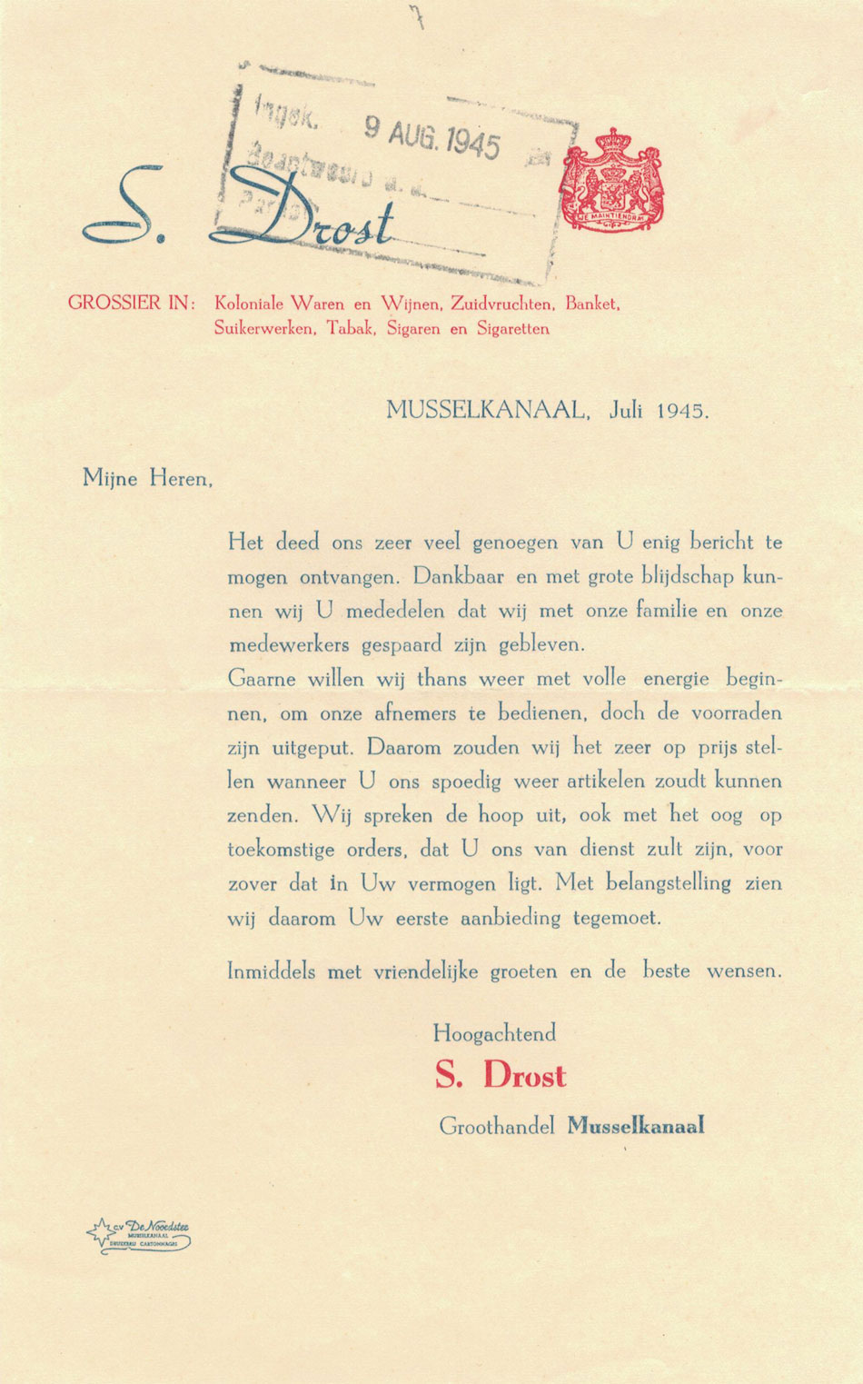 Musselkanaal, 9-8-1945; rondschrijven met wapen van Nederland in oranje druk, afm. ca. 13,5 x 22 cm., in perfecte staat, Prijs € 10.