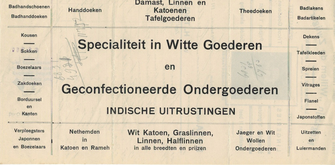 De rekening is 2 bladen groot, elk ca. 22 x 28,5 cm, dus 4 pagina's. De binnenkant van het 2e blad is een aanbiedingsbrief bij de nota in blauw gedrukt schoonschrift (Zeldzaam !). Het document is 2 x gevouwen, Prijs € 35. (VERKOCHT ).