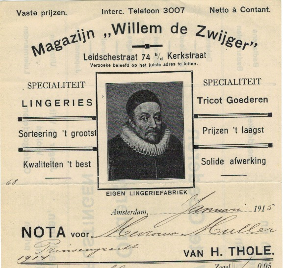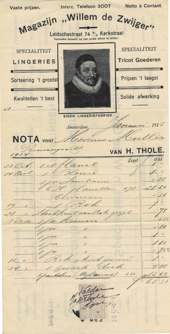 Amsterdam, 1915, gezegelde nota met fraaie gravure van Willem de Zwijger. Afm. 29 x 14,5 cm, 2 lichte vouwen, in prachtige conditie !