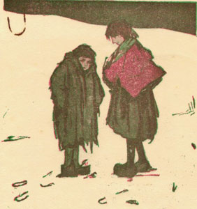 Brieven met een gravure in rood-groene druk van 2 haveloos geklede personen op klompen in de sneeuw.