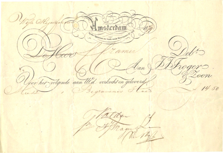 Nota voor mej. Cramer voor aankoop en levering van een begrafenishoed, uitgevoerd in bijzonder sierlijk ouderwets handschrift.