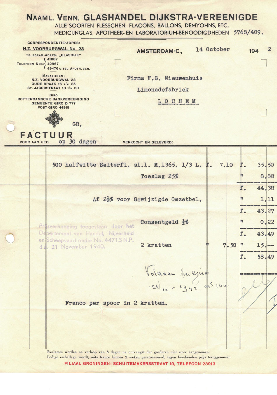 Rekeningen met - als hofleverancier - het Nederlandse wapen van H.M. de Koningin-Weduwe met haar Latijnse lijfspreuk: " Palma sub pondere crescit", vertaald: "De palmboom groeit tegen de verdrukking in."; Afm.