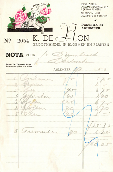 Bekker Bloemenmagazijn nota uit 1946, met afbeelding van een gestileerde bloem, het Fleurop logo en het FTD logo (Hermes = Mercurius, god van de handel), afm. ca. 14 x 20 cm., licht bruin papier, prijs € 50.