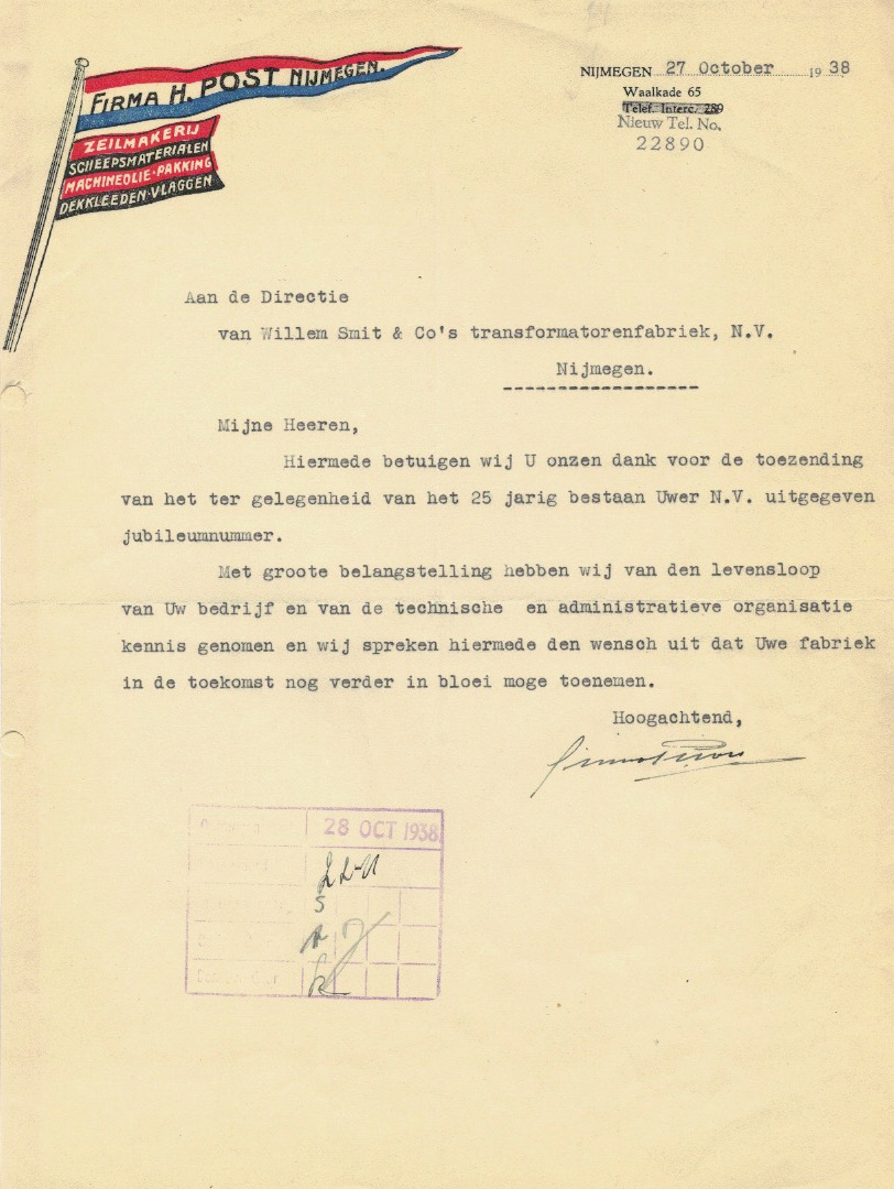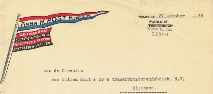 Nijmegen, 1938; Schrijven met afbeelding van de NL vlag.