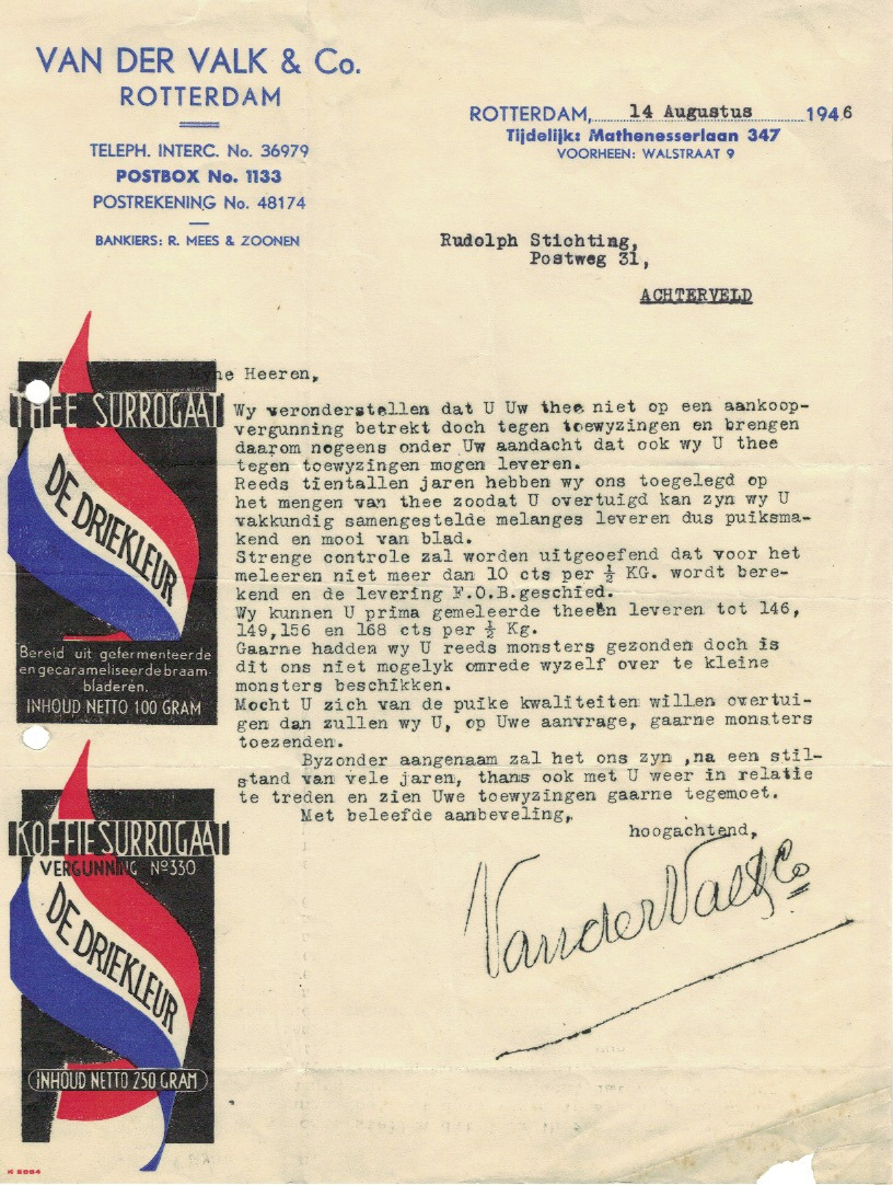 Van der Vlak & Co NB: de thee werd gemaakt van gefermenteerde en gecarameliseerde braambladeren. Schrijven i.v.m. leveringen van koffie en thee.