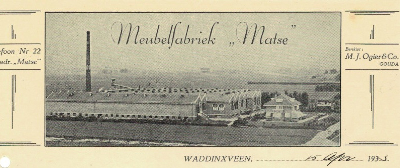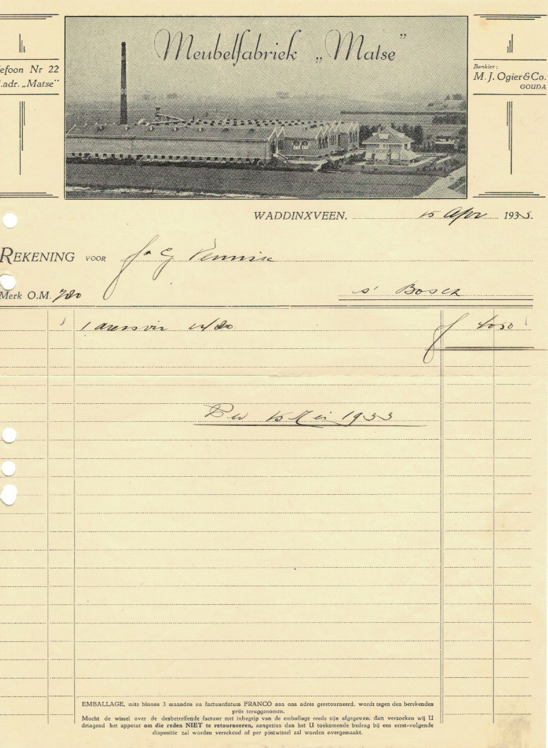 Gezegelde nota uit 1938 met foto-afbeelding van het bedrijf.