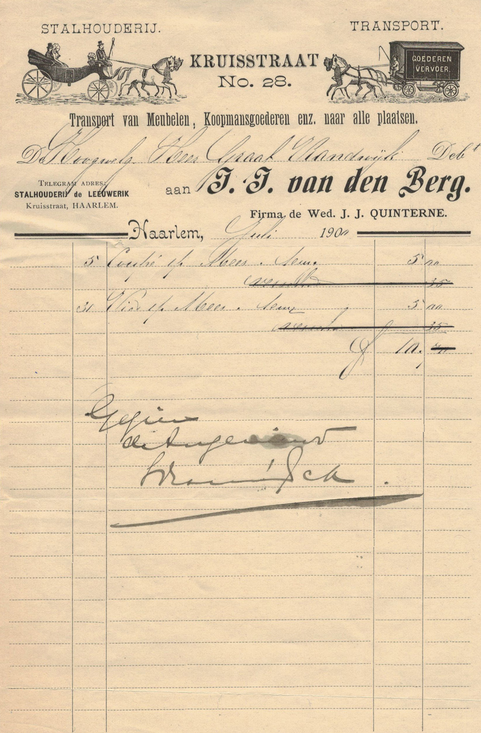 J.J. van den Berg, Stalhouderij, Haarlem, nota uit 1900