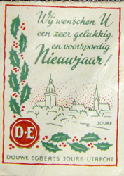Utrecht 1936, rekening met 2 gravures van de fabrieken in Utrecht en Joure, met rood DE logo en Kerst-sluitzegel in de linker bovenhoek. Conditie VF-: div. kreukels en vouwen en onderin een 3 cm scheurtje, prijs € 25.