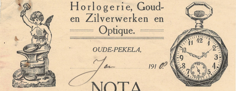 Nota uit 1918 met afbeelding van een zakhorloge en een cherubeintje die een trouwring smeedt.