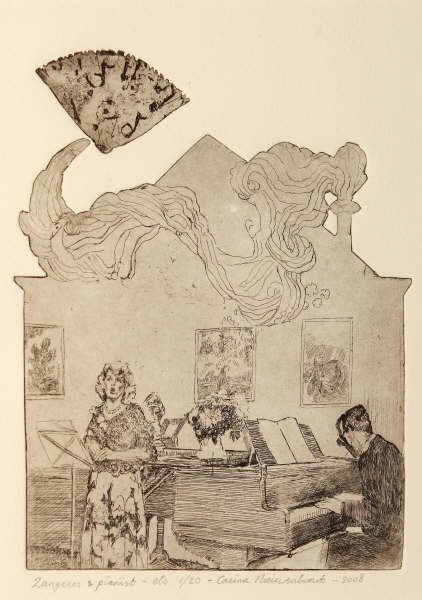 | Zangeres en pianist: Dick Leutscher en Grethe de Vink Singer and piano player: Dick Leutscher en Grethe de Vink - 18 x 23 cm - Lijnets / Line etching - 2008; Prijs € 275 |