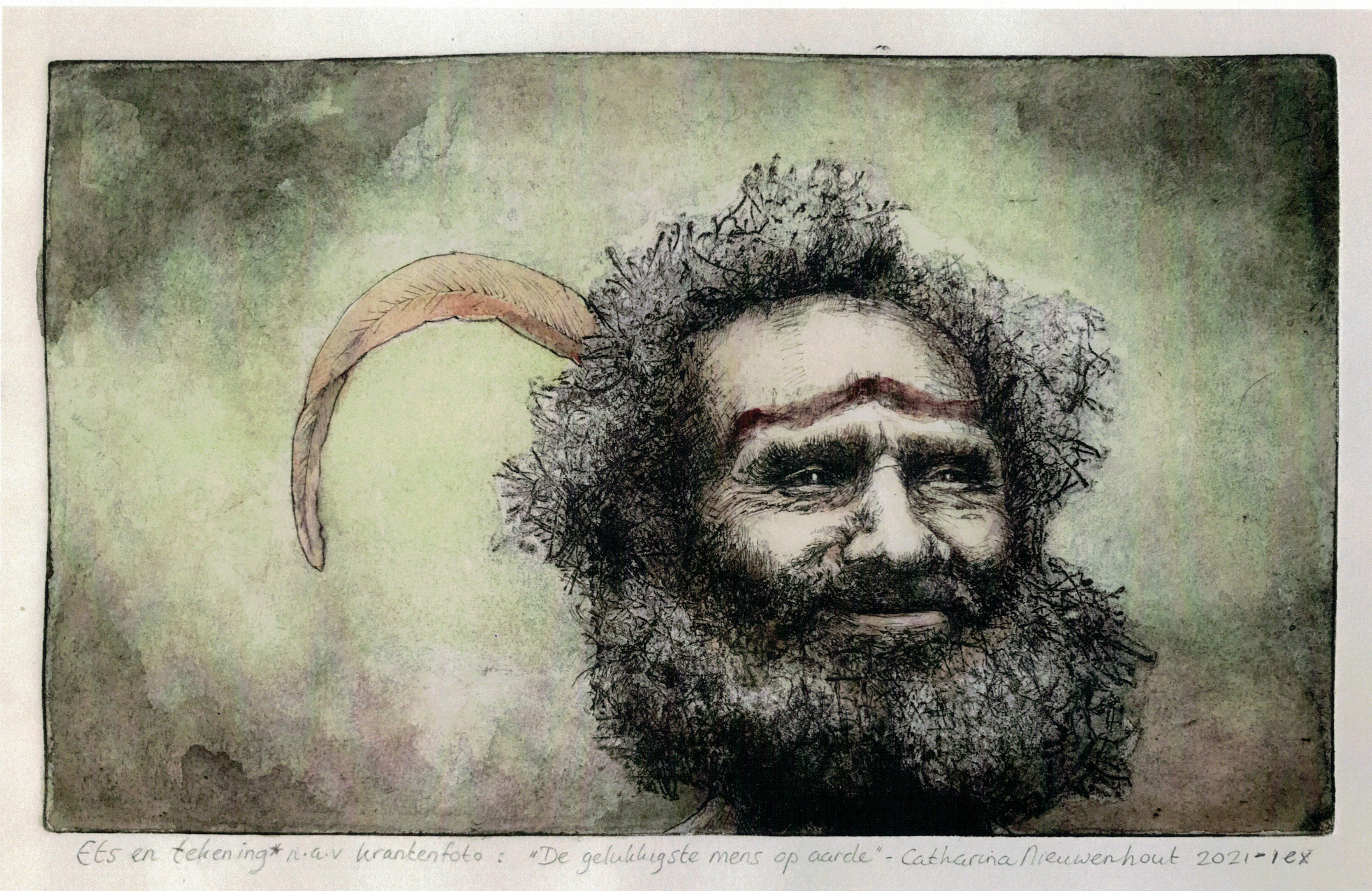 Ets en tekening n.a.v. een krantenfoto: "De gelukkogste mens op aarde" - 2021-1ex.