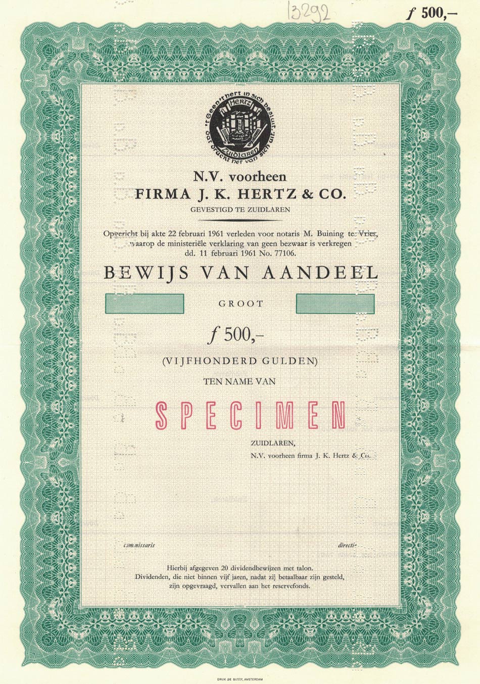 Amsterdam, opgericht 9-1-1961; Bewijs van aandeel f 1000; Zeldzaam SPECIMEN van de bekende drukkerij De Bussy, A'dam; blauwe sierrand, klein fraai logo, ca. 21 x 30 cm.; 1 horizontale vouw; prijs € 50.