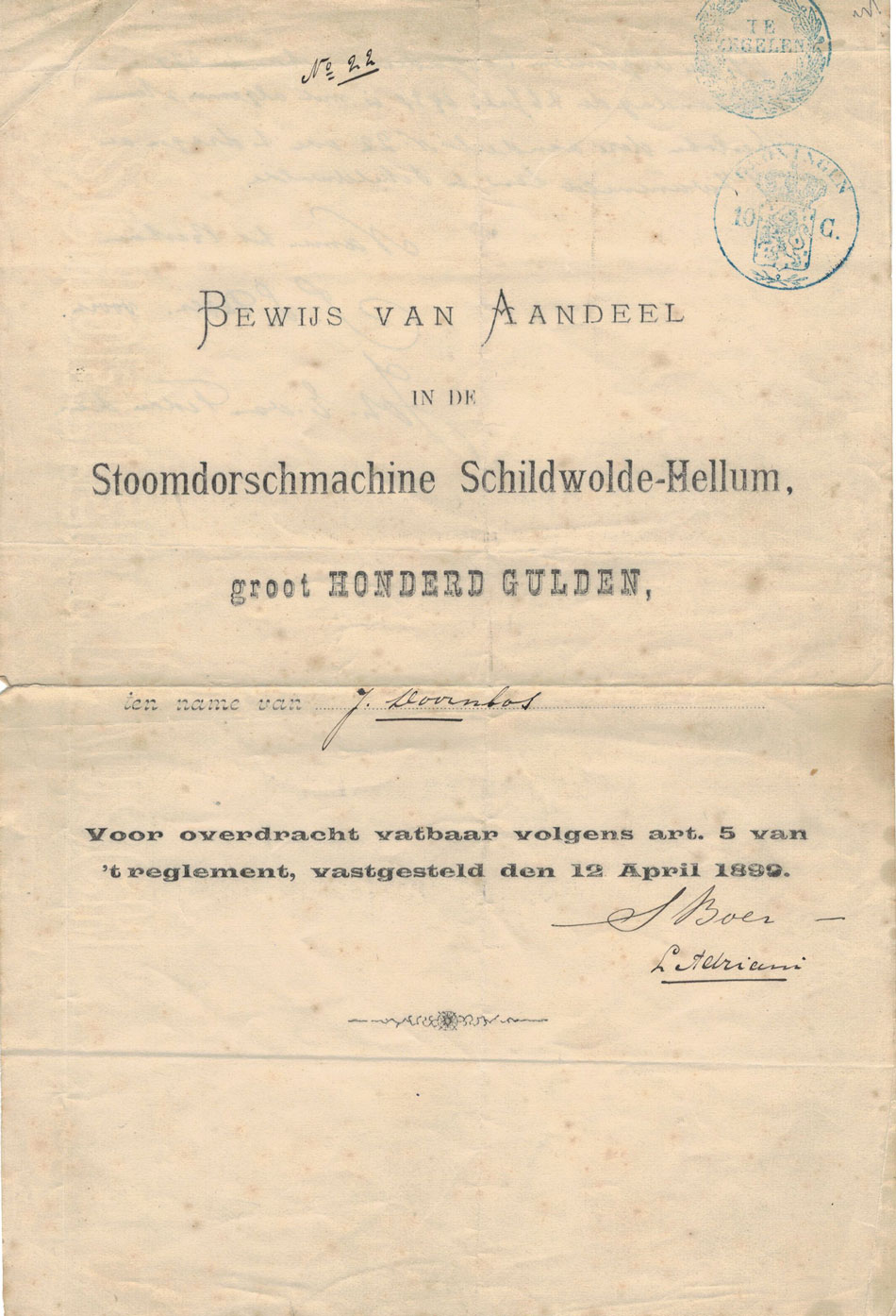 Bewijs van aandeel groot f 100 op naam, uitgegeven in 1899; met 2 blauwe belastingstempels en origineel ondertekend door S. Boer en L. Adriani; afm. ca. 17 x 25 cm. Uit de diverse aandelen kan worden opgemaakt dat de machine in elk geval in 1941 nog dienst deed. Vraag vrijblijvend scans van stukken die U interesseren !