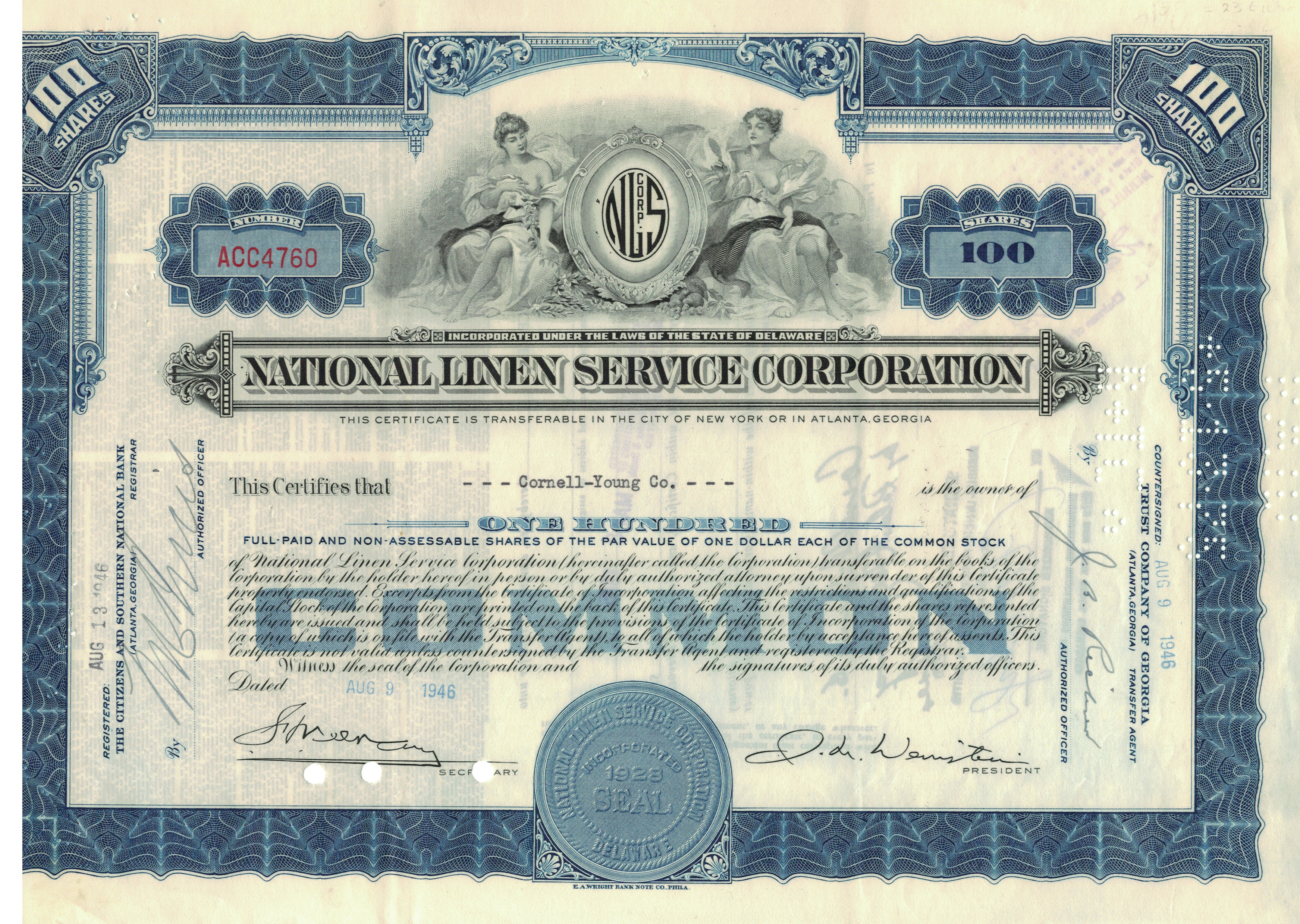 ----- 1947, certificate for < 100 preferred shares, olive border, ; on the back 2 stock transfer stamps and one documentary stamp, condition: pinhole in the middle of the engraving, price € 20.
